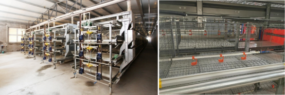 立体养殖采用的环境控制设备大体上与平养模式类似,都包括风机、湿帘、加温系统(风暖或水暖)、通风小窗、导流板和环控仪等。但层叠式笼养时养殖密度大幅提高,配制设备的复杂度大幅提高。需要根据具体饲养量及鸡群体重,按照环境参数细致计算各种设备需要的数量以及安装位置。需要对饲养鸡群所需要的最大最小通风量、风速、通风阻力等进行仔细计算,还需要兼顾考虑进风位置、新进空气温度、通风死角、温差大的问题。配置的环控仪最好是具备智能调控功能的程控仪。