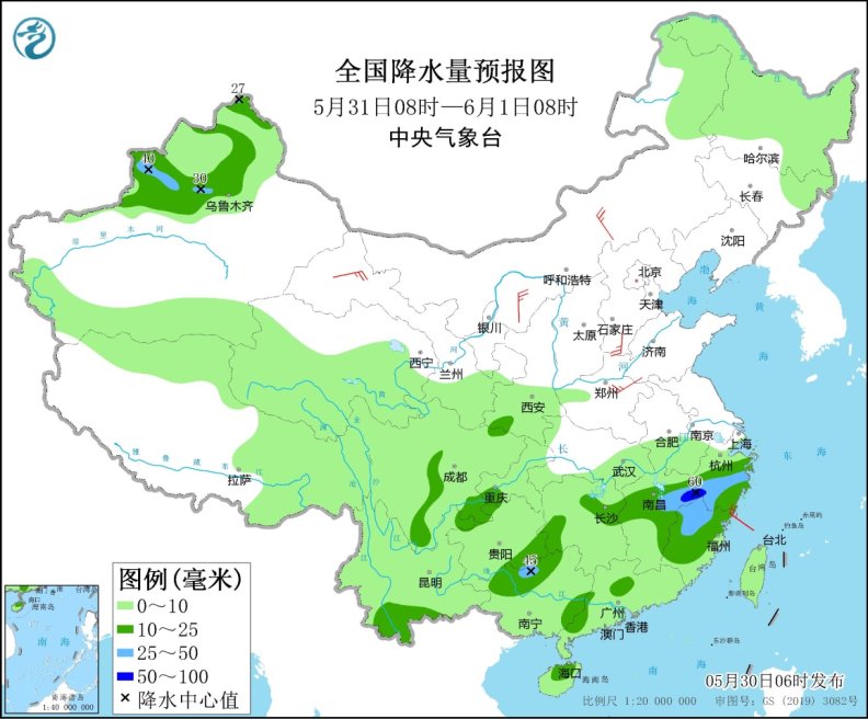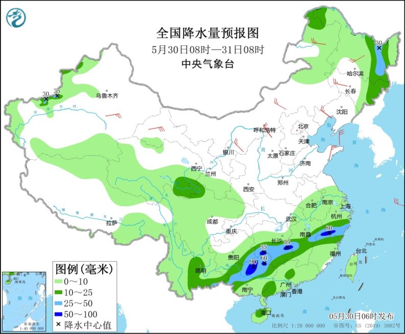 图1 全国降水量预报图(5月30日08时-31日08时)