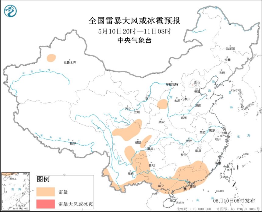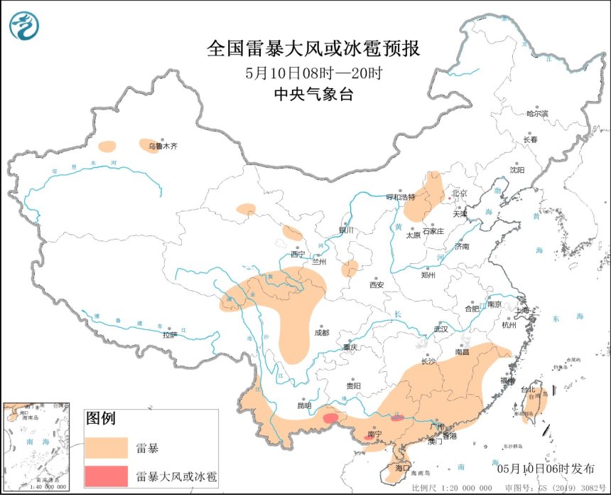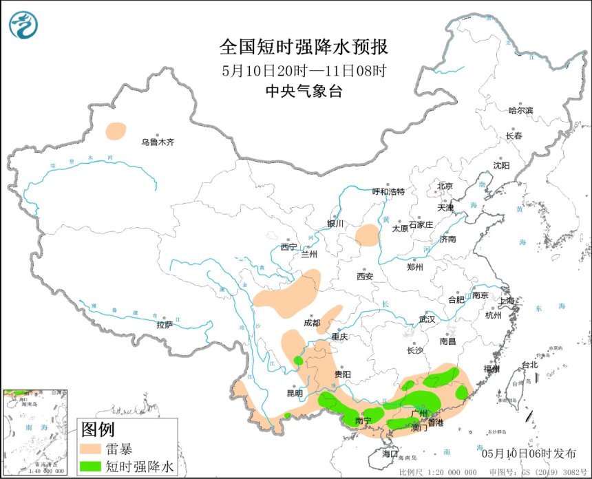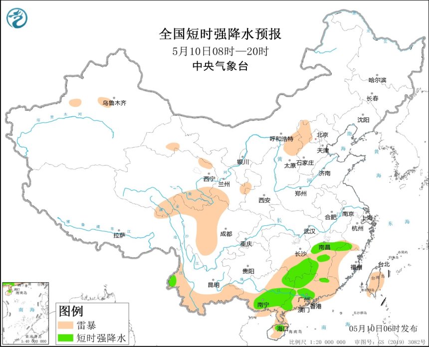 预计5月10日08时至11日08时,湖南南部、江西、福建西北部、云南西部和南部、广西西部和南部、广东、海南岛东北部等地的部分地区将有短时强降水天气,小时雨量20-50毫米,局地可达60毫米以上;另外,云南东南部、广西南部等地的局地将有雷暴大风或冰雹天气。