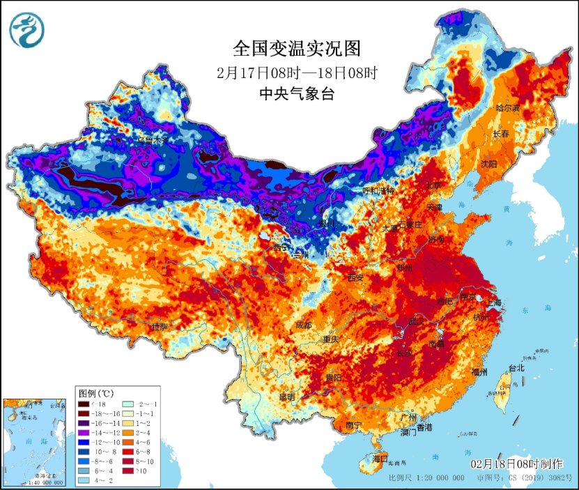预计2月18日08时至20日08时,新疆南疆盆地、内蒙古大部、西北地区东部、华北北部、东北地区、黄淮、江淮、江汉、江南北部等地将降温6~10℃,其中,南疆盆地西部、内蒙古大部、东北地区大部等地降温12~16℃,局地可达18℃以上。