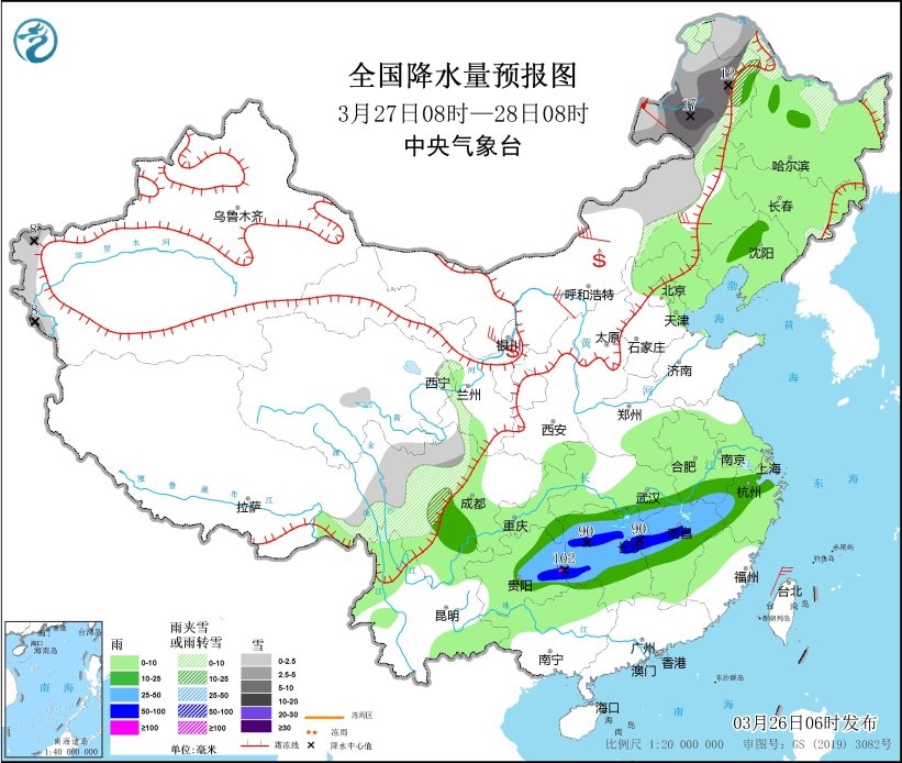3月27日08时至28日08时,内蒙古东北部、黑龙江北部、新疆南疆西部山区、西藏东北部、川西高原北部等地部分地区有小到中雪或雨夹雪,其中,内蒙古东北部等地部分地区有大雪,局地暴雪(10~17毫米)。安徽南部、浙江西部和北部、江西中北部、湖北东南部、湖南中北部、贵州东部、重庆东南部等地部分地区有中到大雨,其中,贵州东部、湖南中部、江西西北部等地部分地区有暴雨,贵州东部局地大暴雨(100~102毫米)。内蒙古中西部和东南部等地部分地区有5~7级风,阵风8~10级。渤海、渤海海峡、黄海、东海大部海域、台湾海峡、台湾以东洋面、巴士海峡、南海东北部海域将有5~7级,阵风8~9级的风。内蒙古中西部、宁夏等地将有扬沙或浮尘天气(见图2)。