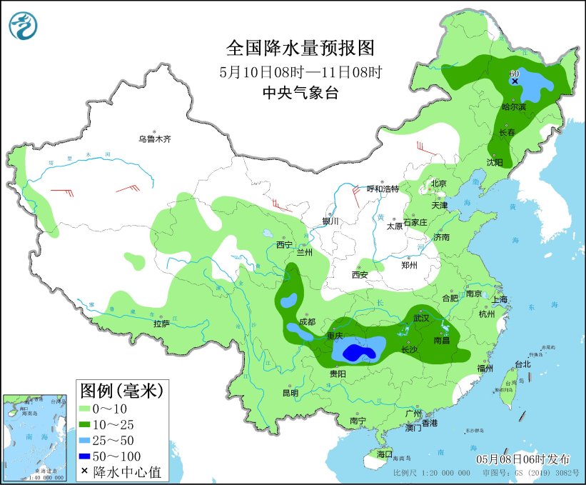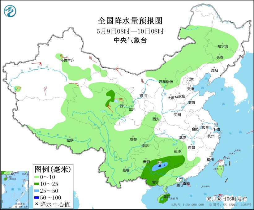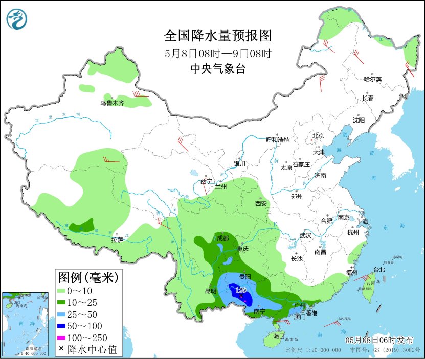 5月8日08时至9日08时,西南地区东部和南部、华南大部等地的部分地区有中到大雨,其中,贵州西南部、云南东部、广西西部等地的部分地区有暴雨或大暴雨(100~120毫米)。内蒙古中东部、黑龙江、吉林、辽宁、新疆南疆盆地、西藏东北部、青海东部、甘肃河西等地的部分地区有4~6级风,局地有7~9级风(见图1)。东海北部海域、台湾海峡有5~7级、阵风8级的偏北风,巴士海峡、南海东北部海域有5~7级、阵风8级的偏东到东北风。
