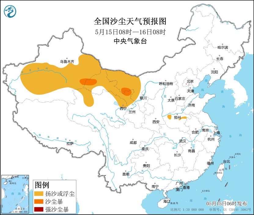 预计,5月15日白天,内蒙古西部和东部、新疆东部、青海北部、甘肃西部和东部、宁夏、山东东部、河南中南部、安徽中北部、江苏、上海、浙江北部等地部分地区有5~6级、阵风7~9级的大风,其中内蒙古西北部、新疆东部等地部分地区有7~8级、阵风9~10级的大风,气温下降4~8℃;新疆南部和东部、甘肃西部、内蒙古西部、青海北部以及河南中部等地有扬沙或浮尘天气,其中新疆东部、甘肃西部、内蒙古西部等地局地有沙尘暴;5月15日08时至16日08时,黄海中部和南部、东海东北部、台湾海峡将有7级、阵风8~9级的大风。为此,中央气象台5月15日06时继续发布大风蓝色预警和沙尘暴蓝色预警。