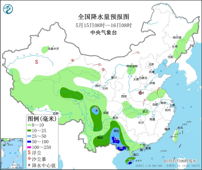 5月15日08时至16日08时,四川西南部、云南南部、贵州中西部、广西西部和南部、海南岛等地的部分地区有中到大雨,其中云南东南部、广西西部和南部、海南岛南部等地的部分地区有暴雨,局地大暴雨(100~110毫米)。新疆东部、内蒙古中西部、西北地区东部、黄淮南部、江淮、江南东北部等地的部分地区有4~6级风,其中内蒙古西部等地的部分地区有7~8级风。新疆南部和东部、甘肃西部、内蒙古西部、青海北部以及河南中部等地有扬沙或浮尘天气,其中新疆东部、甘肃西部、内蒙古西部等地局地有沙尘暴(见图3)。