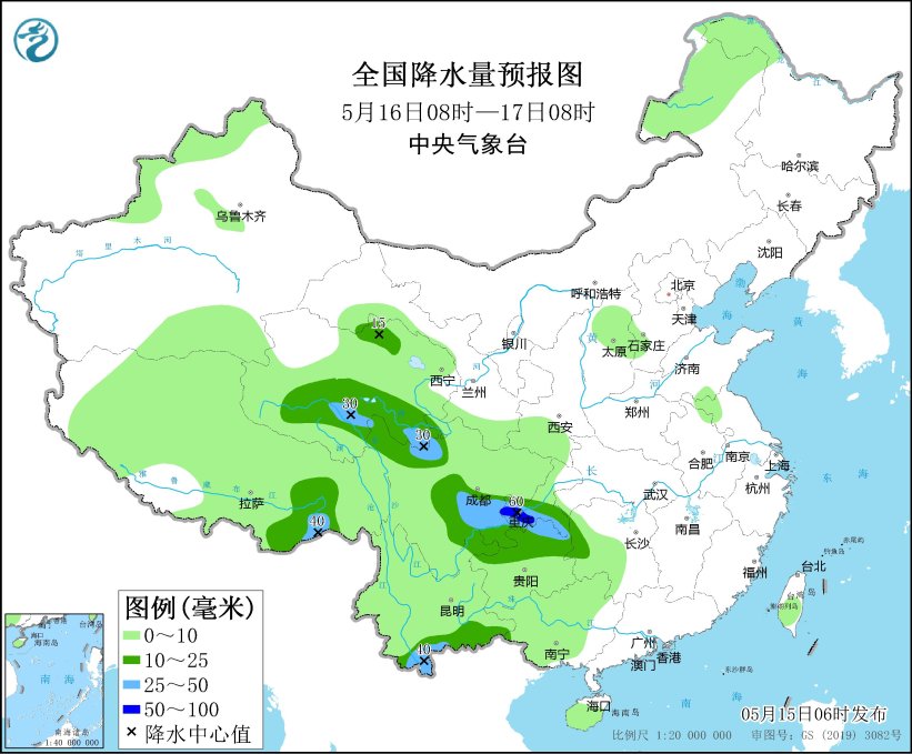 5月16日08时至17日08时,青海南部、四川西北部和南部、重庆中南部、贵州北部、云南南部和东北部以及西藏东南部等地的部分地区有中到大雨,其中重庆西部等地的部分地区有暴雨(50~60毫米)(见图4)。内蒙古中部、浙江东部等地的部分地区有4~5级风;台湾海峡有5~7级、阵风8~9级的偏东到东北风。