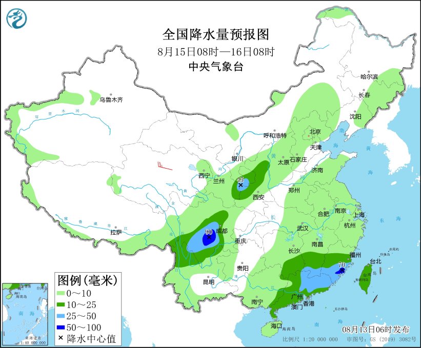 8月14日08时至15日08时,甘肃东南部、川西高原北部、江淮西部、江南中东部和南部、华南大部、台湾岛等地部分地区有中到大雨,其中,福建东南部等地局地有暴雨(50~70毫米)(见图3)。