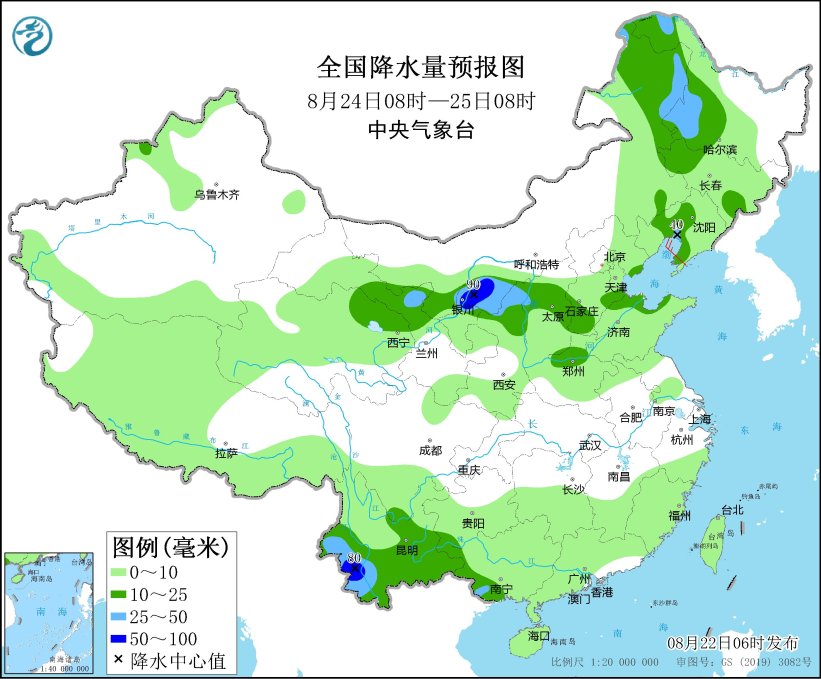 8月24日08时至25日08时,内蒙古东北部和河套地区、东北地区西部和南部、华北西部、宁夏北部、陕西北部、青海东北部、甘肃河西、云南中南部、广西西部等地部分地区有中到大雨,其中,内蒙古河套地区、宁夏北部、云南西南部等地局地有暴雨(50~90毫米)(见图4)。