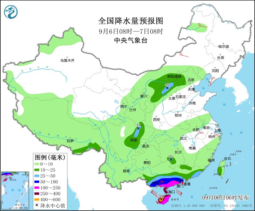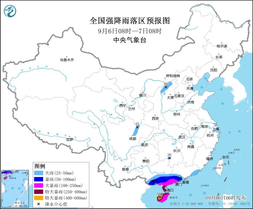 中央气象台9月6日06时发布暴雨橙色预警和强对流天气蓝色预警。预计,9月6日08时至7日08时,山西北部、四川盆地西北部、广西东南部、广东西南部和海南岛等地部分地区有大到暴雨,其中,广西东南部沿海、广东西南部、海南岛等地部分地区有大暴雨,广东西南部沿海、海南岛中西部和北部局地特大暴雨(250~500毫米)。上述部分地区伴有短时强降水(最大小时降雨量50~80毫米,局地可超过100毫米)(见图2)。西南地区东南部、江南西部和南部、华南南部和中东部等地的部分地区将有8级以上雷暴大风或冰雹天气,其中,广西南部和东南部沿海、广东西南部和南部沿海、海南岛等地的部分地区将有10级以上雷暴大风,最大风力可达11级以上,广东南部沿海和海南岛等地局地不排除出现龙卷的可能性(见图3)。