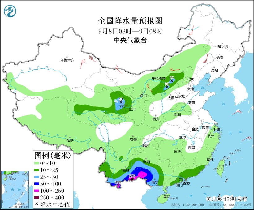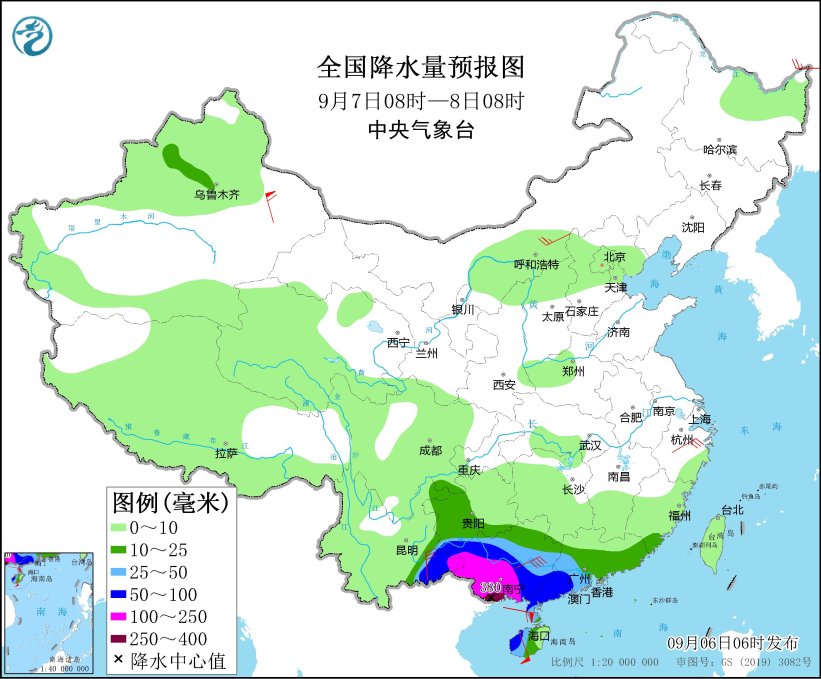 9月7日08时至8日08时,云南东南部、广西中南部、广东西南部、海南岛等地部分地区有大到暴雨,其中,云南东南部、广西南部等地部分地区有大暴雨,广西西南部和东南部沿海等地局地特大暴雨(250~380毫米)。内蒙古中部、浙江中部、云南东南部、广西东南部、海南岛中部等地部分地区有4~6级风,其中,广西东南部部分地区有6~7级风,新疆东部部分地区有8~9级风(见图6)。