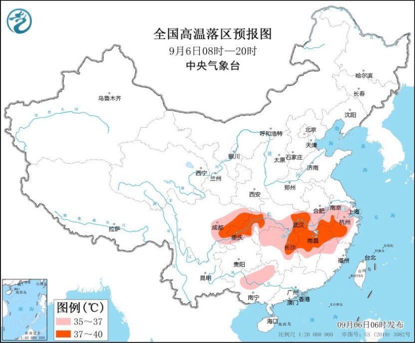 四川东部、重庆、贵州东部、湖北中南部及江准西部、江南中西部、华南中西部等地部分地区出现35~39℃高温天气,四川达州、重庆等局地40~42.8℃。