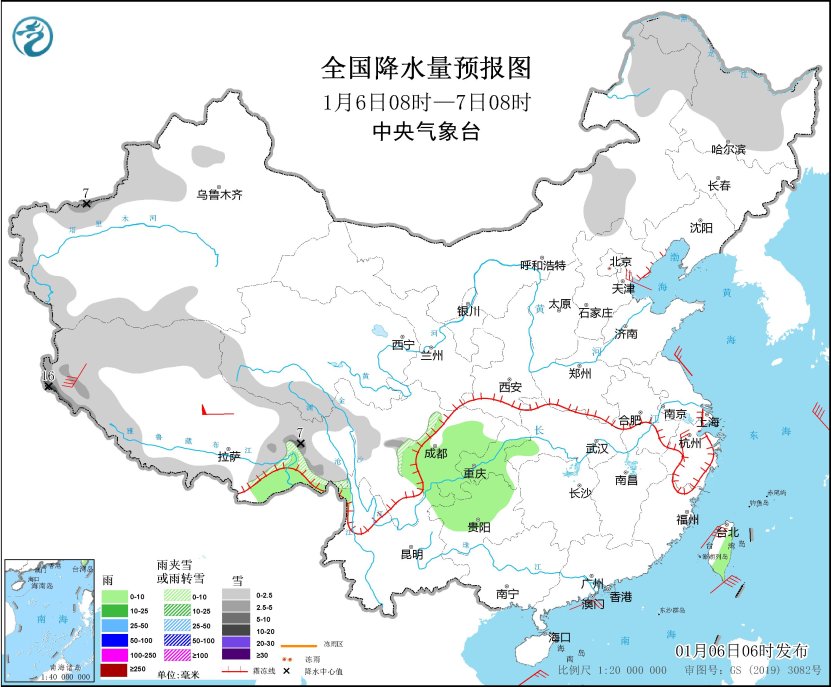 1月6日08时至7日08时,内蒙古中东部、黑龙江大部、新疆伊犁河谷和南疆盆地、西藏西部和东部、青海南部、川西高原北部、山东半岛北部等地部分地区有小到中雪或雨夹雪,其中,新疆南疆西部山区、西藏西部等地部分地区有大雪,局地暴雪(10~16毫米)。西藏东南部、湖北西南部、重庆大部、贵州西北部、云南东北部、台湾岛东部等地部分地区有小雨。内蒙古中东部、辽东半岛、山东半岛、浙江北部等地部分地区有4~6级风(见图1)。