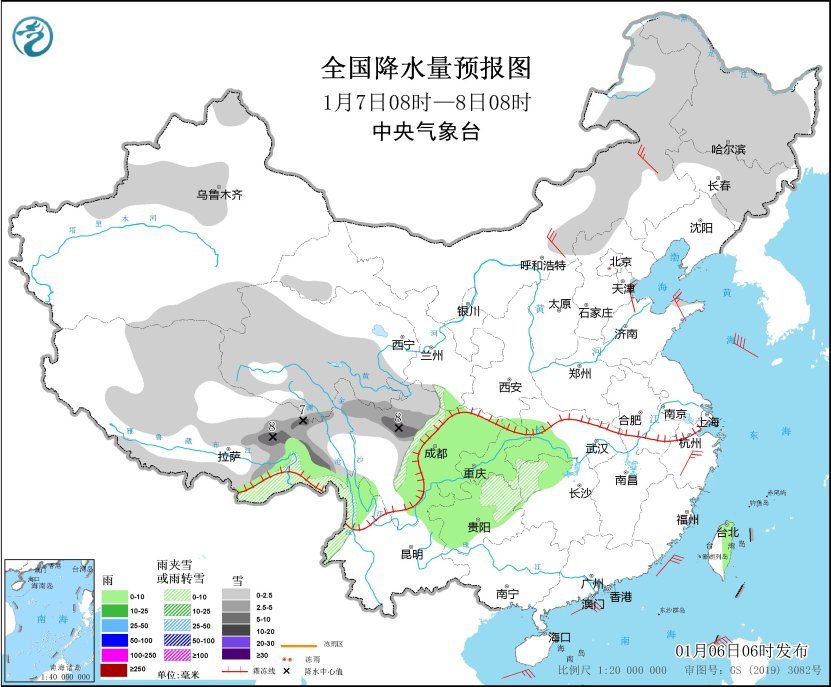 1月7日08时至8日08时,内蒙古东部、黑龙江大部、吉林大部、新疆北疆北部和伊犁河谷、西藏东部和南部、青海中南部、甘肃南部、川西高原、湖南西北部、贵州东部、山东半岛北部等地部分地区有小到中雪或雨夹雪,其中,西藏东部、川西高原北部等地部分地区有大雪(5~8毫米)。西藏东南部、甘肃南部、湖北西南部、湖南北部、四川盆地、重庆、贵州中西部、云南东北部、台湾岛东部等地部分地区有小雨。内蒙古中东部、山东半岛、浙江中部等地部分地区有4~6级风(见图2)。