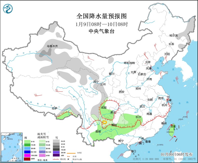 图2 全国降水量预报图(1月9日08时-10日08时)