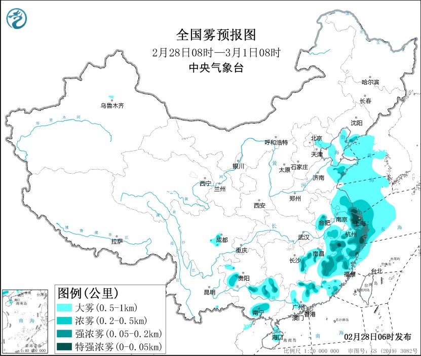 预计,2月28日早晨至上午,山东半岛、江苏、上海、安徽南部、浙江、福建大部、江西北部、广西中部、广东北部、海南岛北部等地的部分地区有大雾,其中江苏中南部、上海、安徽南部、江西北部、浙江中东部、福建北部、广西中部等地的部分地区有能见度低于500米的浓雾,局地有能见度低于200米的强浓雾。此外,28日白天至夜间,渤海、渤海海峡、黄海大部海域、东海西部沿岸海域、北部湾西部沿岸海域、琼州海峡、杭州湾附近海域、长江口附近海域、舟山群岛附近海域、江苏沿岸海域、浙江沿岸海域、辽东半岛东部沿岸海域、山东半岛沿岸海域、上海港、宁波港将有能见度不足1公里的大雾,部分地区有能见度不足500米的浓雾。中央气象台2月28日06时继续发布大雾黄色预警。