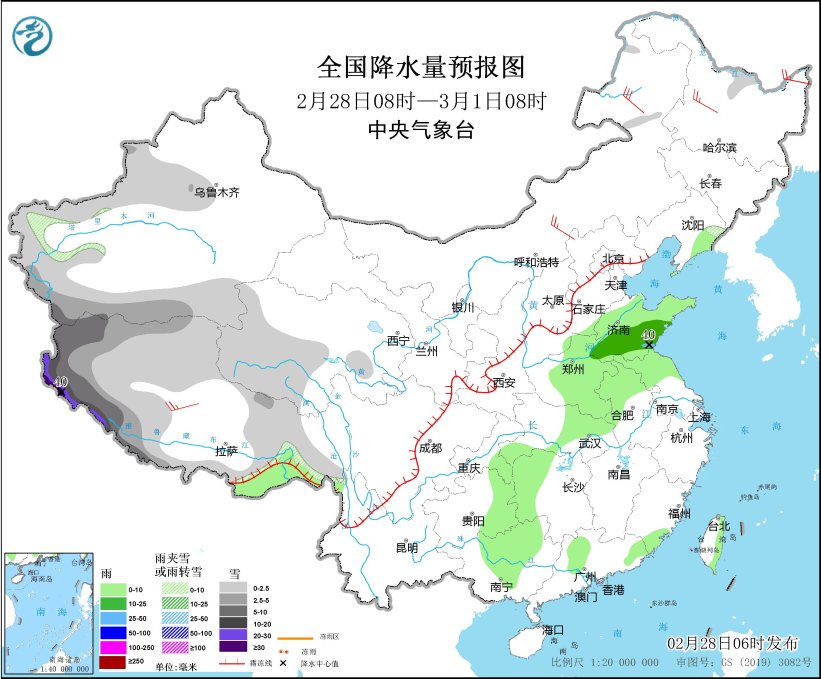 2月28日08时至3月1日08时,西藏大部、新疆西部和沿天山地区、青海西部、内蒙古东北部、黑龙江北部等地部分地区有小到中雪或雨夹雪,其中,西藏西部部分地区有大到暴雪,局地大暴雪或特大暴雪(30~40毫米)。黄淮大部、江淮北部、江汉东部、江南西部、华南北部、台湾岛东部等地部分地区有小到中雨,其中,山东东南部局地有大雨(25~40毫米)。内蒙古中东部、黑龙江、河北北部、西藏北部等地部分地区有4~6级风;南海东北部、巴士海峡等海域有5~6级风(见图2)。
