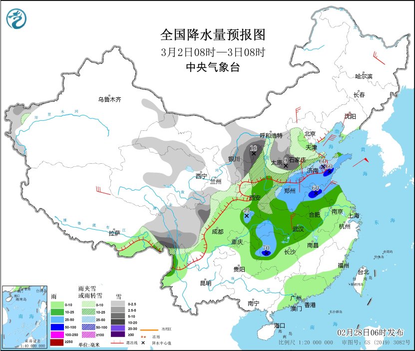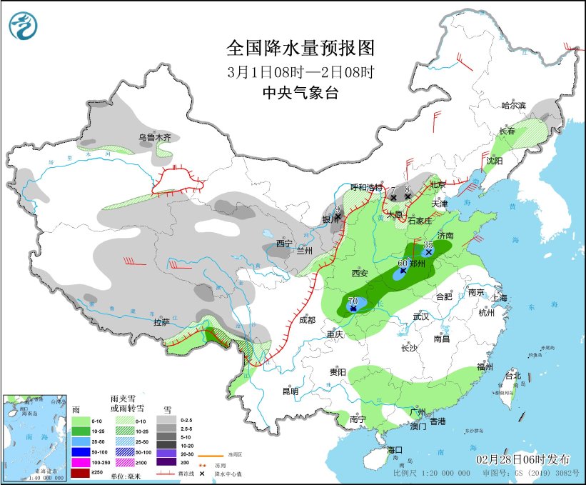 3月1日08时至2日08时,西北地区中东部、华北西北部、东北地区东部、新疆东南部和沿天山地区、西藏中南部等地部分地区有小到中雪或雨夹雪,其中,内蒙古河套地区、宁夏中北部、山西北部等地部分地区有大雪(5~9毫米)。华北南部、黄淮、江汉、西北地区东部、华南中东部等地部分地区有小到中雨,其中,山东西南部、河南中部、重庆东北部等地部分地区有大雨,局地暴雨(50~70毫米)。内蒙古中部、辽宁西部、河北南部、河南北部、山东等地部分地区有4~6级风;渤海、东海北部等海域有5~7级风(见图3)。