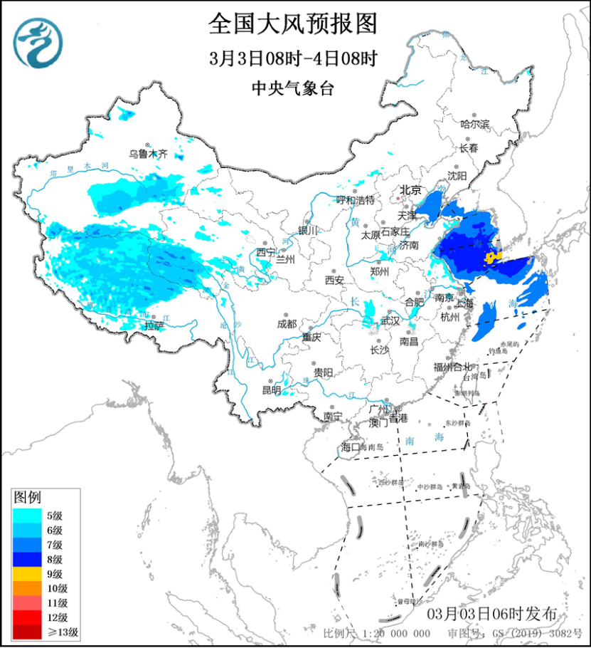 预计,3月3日08时至4日08时,新疆南疆盆地和东部、西藏中北部、青海南部等地部分地区有5~6级风、阵风7~8级;渤海、渤海海峡、黄海大部海域、东海北部和西南部海域将有7~8级、阵风9级的大风,其中黄海东南部的部分海域风力可达9级、阵风10级(见图2)。中央气象台3月3日06时继续发布大风蓝色预警。
