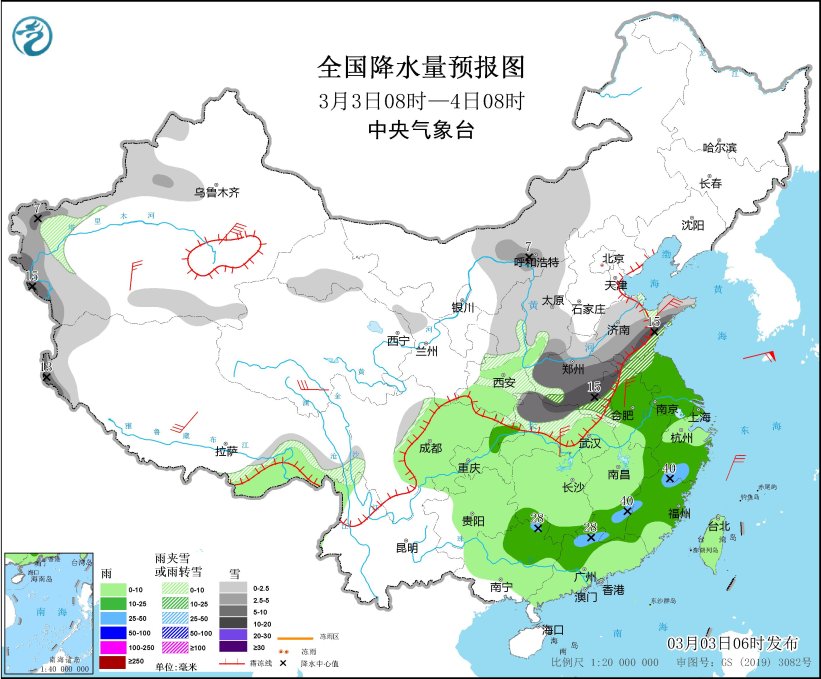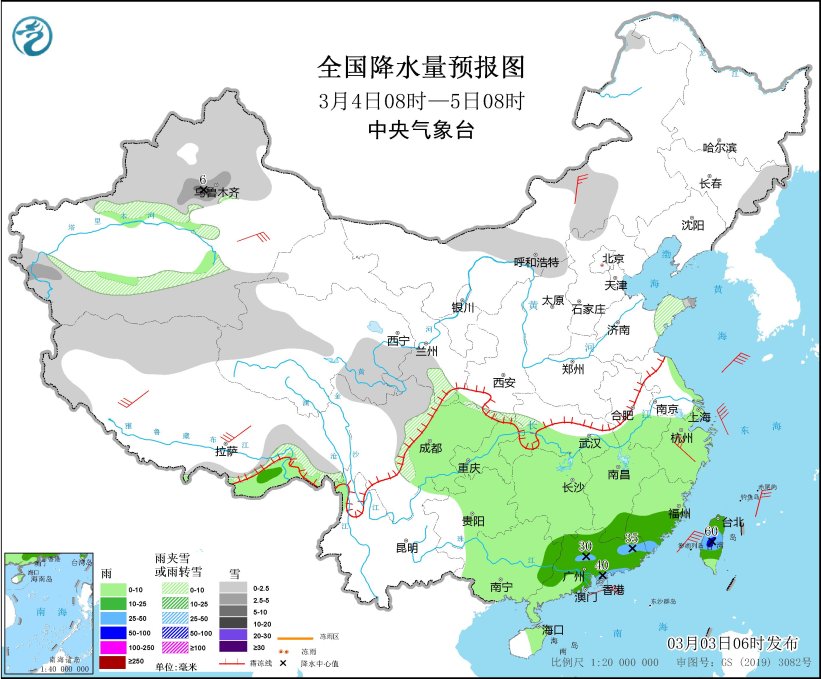 3月3日08时至4日08时,黄淮大部、华北西部和南部、内蒙古中部、安徽北部、江苏北部、湖北北部以及新疆伊犁河谷和南疆西部山区、西藏西部等地部分地区有小到中雪或雨夹雪,其中,山东南部、河南中南部、安徽西北部、湖北西北部等地部分地区有大到暴雪(10~15毫米)。江淮大部、江南、西南地区东部和南部、华南大部、台湾岛等地部分地区有小到中雨,其中,江西南部、浙江南部、福建北部、广西东北部、广东西北部等地部分地区有大雨(25~40毫米)。新疆南疆盆地、西藏中南部、青海南部、山东半岛、安徽中北部、湖北中南部等地部分地区有4~6级风,其中,新疆南疆盆地部分地区有6~7级风(见图5)。黄海南部有8~9级、阵风10级的偏东风,黄海中部、东海北部有6~8级、阵风9级的东北风到偏东风,东海南部有5~7级、阵风8级的西南风转偏北风。