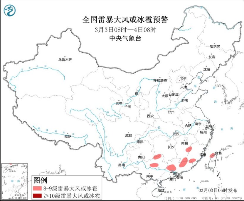 此外,未来三天,南方大部地区有小到中雨,其中,江南东部和南部、华南东部和北部、台湾岛等地的部分地区有大雨,局地暴雨。预计,3月3日08时至4日08时,湖南西南部、江西东部和南部、福建西部和南部、广西东北部、广东中北部、台湾岛北部等地的部分地区将有8级以上雷暴大风或冰雹天气,局地风力可达10级;湖南南部、江西中南部、浙江南部、福建北部和东南部、贵州东南部、广西中北部、广东大部、台湾岛中北部等地的部分地区将有小时雨量大于20毫米的短时强降水天气,局地小时雨量可达50毫米(见图4)。中央气象台3月3日06时继续发布强对流天气蓝色预警。