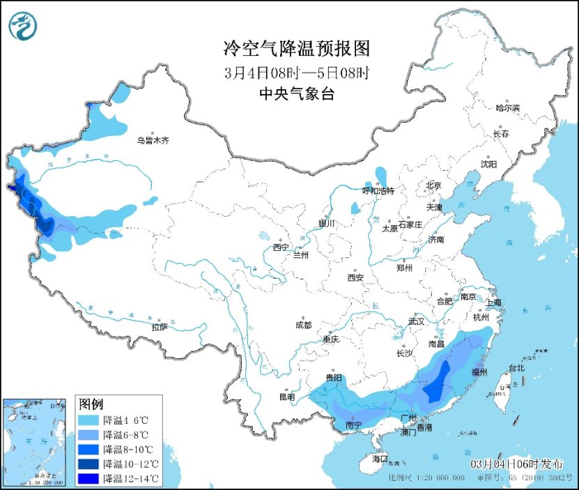 随着寒潮不断南下入海,今天,其对我国陆地的影响将趋于结束,雨雪明显减弱,降温区转移至江南南部、华南等地,预计会出现4~6℃降温,其中江西南部、福建西南部、广东东北部等地部分地区降温可达8℃以上。