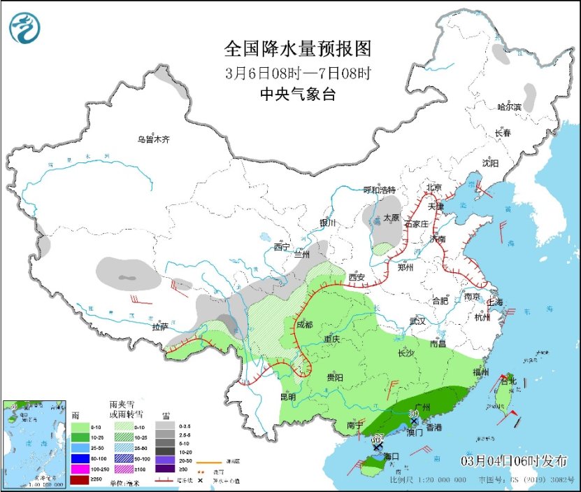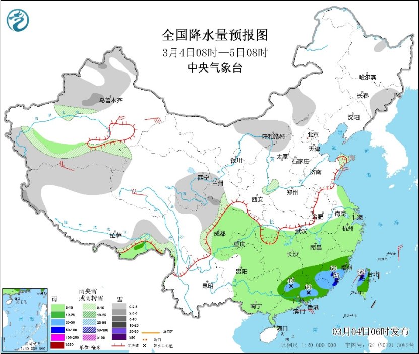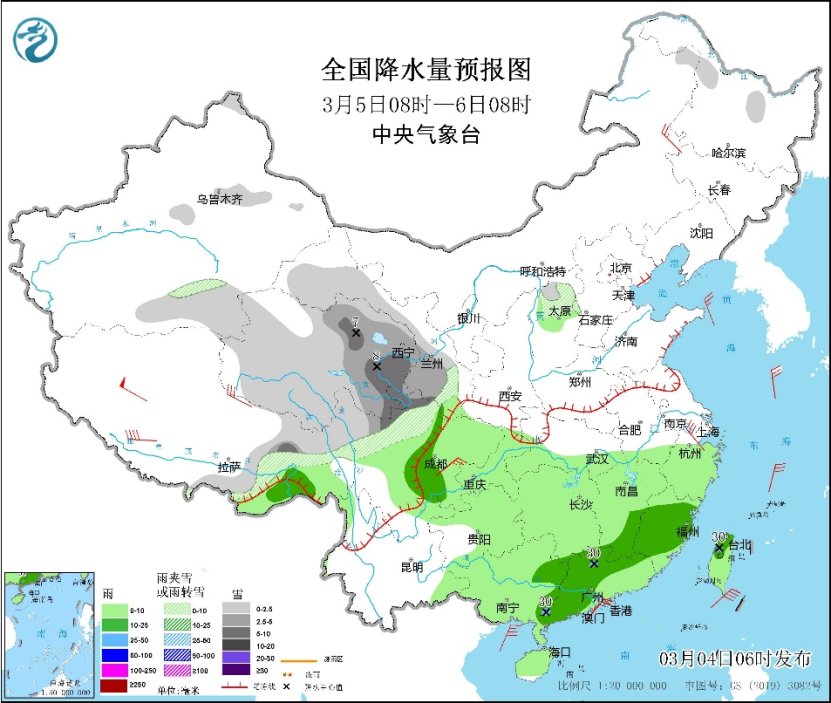 另外,未来三天,西南地区东部、江南、华南等地有小到中雨,其中,广东、福建、海南岛、台湾岛等地部分地区有大雨,局地暴雨,局地还将伴有雷暴大风或冰雹等强对流天气。5日至6日,青藏高原有小到中雪或雨夹雪,青海、甘肃部分地区有大雪。雨雪天气道路易出现湿滑、积雪结冰现象,公众外出需注意交通安全。