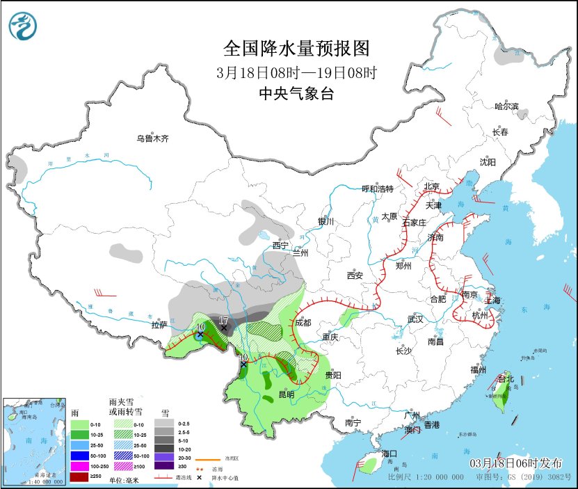 3月18日08时至19日08时,西藏东部、青海东部和南部、甘肃西南部、川西高原、贵州西北部、黑龙江北部等地部分地区有小到中雪或雨夹雪,其中,西藏东部、川西高原等地部分地区有大雪,局地暴雪(10~17毫米)。西藏东南部、四川盆地西部、云南大部、重庆北部、贵州西部、广西西北部、海南岛南部、台湾岛等地部分地区有小雨,其中,西藏东南部、云南西北部、台湾岛东部等地部分地区有中雨,局地有大雨(25~40毫米)。内蒙古中部、河北西北部、西藏西部等地部分地区有4~6级风;黄海东南部海域、东海东北部海域、台湾海峡、台湾以东洋面、巴士海峡、南海大部海域将有7~8级风(见图2)。