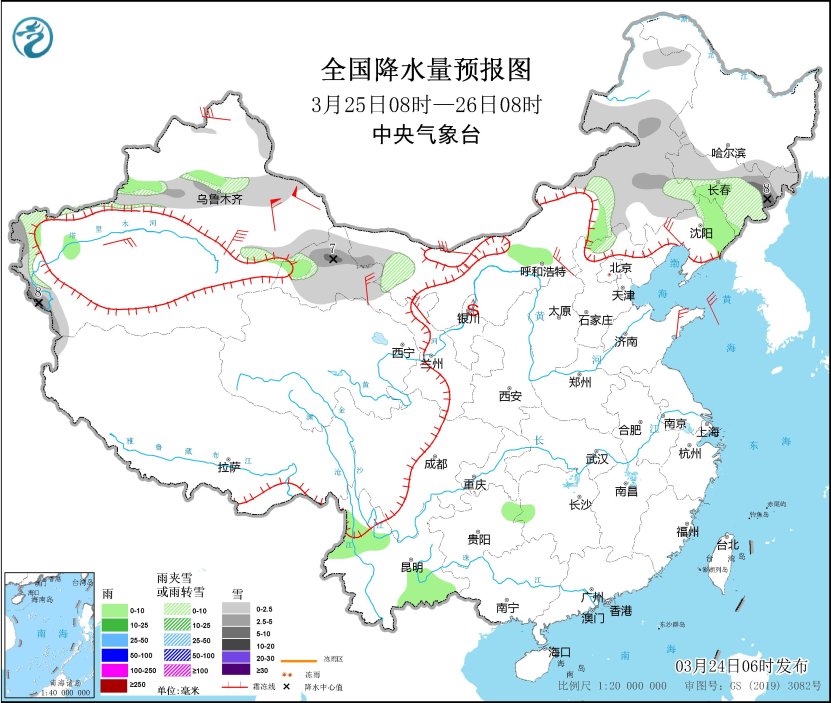 3月24日08时至25日08时,新疆北部和沿天山地区、内蒙古东部、黑龙江西北部、吉林西北部和东部、河北北部等地部分地区有小到中雪或雨夹雪,其中,新疆阿勒泰和沿天山高海拔地区、内蒙古东部等地部分地区有大到暴雪(10~15毫米)。新疆沿天山地区和伊犁河谷、内蒙古东南部和西北部、辽宁北部、华北北部、西南地区南部和东部等地部分地区有小雨,其中,新疆伊犁河谷等地部分地区有中到大雨。内蒙古中西部、山西北部、河北北部、黑龙江西部、山东半岛、新疆北部等地部分地区有4~6级风。内蒙古西部、宁夏北部等地部分地区有扬沙或浮尘,局地有沙尘暴(见图1)。