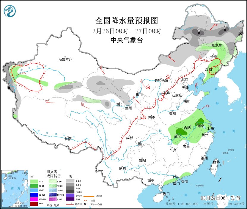 3月26日08时至27日08时,内蒙古东部、黑龙江大部、吉林东部、新疆南疆西部山区、甘肃河西、青海北部等地部分地区有小到中雪或雨夹雪,其中,内蒙古东北部、黑龙江中东部、新疆南疆西部山区等地部分地区有大雪(5~9毫米)。吉林中部、辽宁东部、江淮大部、江汉东部、江南北部、广东南部沿海等地部分地区有小雨,其中,湖北东部、安徽中部、江苏西南部等地部分地区有中雨。内蒙古大部、西北地区中东部、华北大部、东北地区西部、新疆南疆盆地等地部分地区有4~6级风。内蒙古中西部、宁夏等地部分地区有扬沙(见图3)。