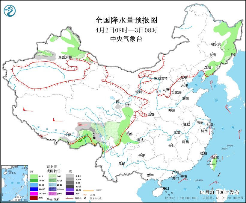4月1日08时至2日08时,新疆沿天山地区和伊犁河谷高海拔地区、青海南部、西藏东部、川西高原、内蒙古东部、河北北部、黑龙江中部、吉林中东部等地部分地区有小雪或雨夹雪,其中,新疆伊犁河谷高海拔地区、西藏东北部、青海东南部、川西高原北部等地部分地区有中到大雪,西藏东北部、川西高原北部等地局地有暴雪(10~13毫米)。新疆北疆北部、西藏东南部、四川盆地西部和中部、重庆南部、贵州西部、云南南部和东北部、内蒙古东部、辽宁南部和东部、吉林西部、黑龙江中部和东北部、海南岛南部、台湾岛等地部分地区有小到中雨。内蒙古中部、辽东半岛、河北北部、西藏中南部等地部分地区有5~6级风,其中,西藏中部部分地区有7~8级风;渤海、渤海海峡、黄海西部、东海、台湾海峡、台湾以东洋面、巴士海峡、南海中北部等海域有6~7级风,阵风8~9级(见图1)。