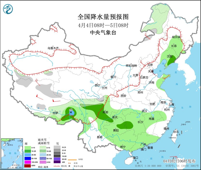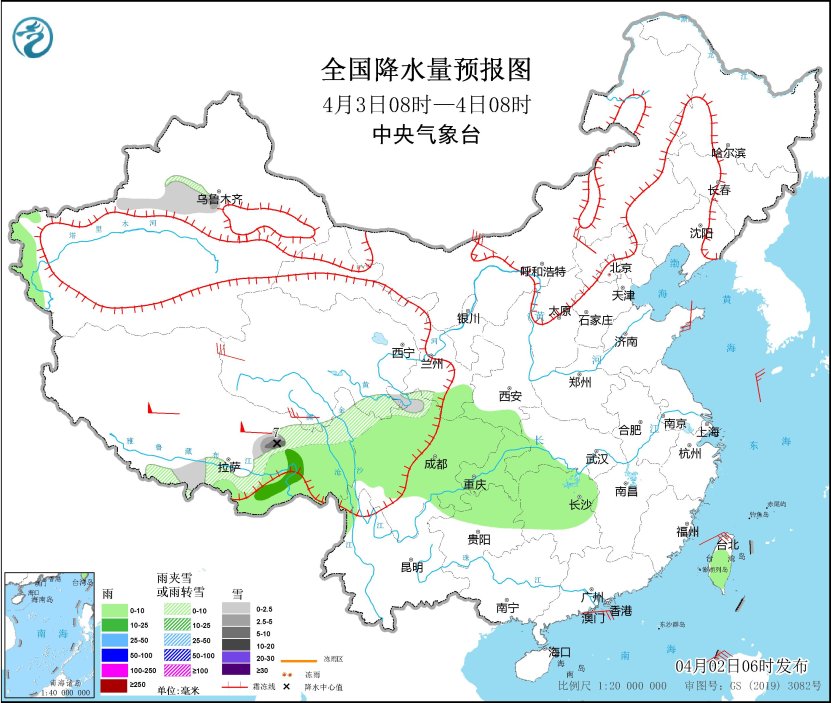 4月2日至4日,青藏高原东部、内蒙古中东部、东北地区东部、新疆北部高海拔地区等地部分地方有小到中雪或雨夹雪,其中,西藏东部、川西高原北部等地部分地区有大到暴雪。此外,受弱冷空气影响,西藏东南部、西南地区东部、江南西部、台湾岛等地部分地区有小到中雨。