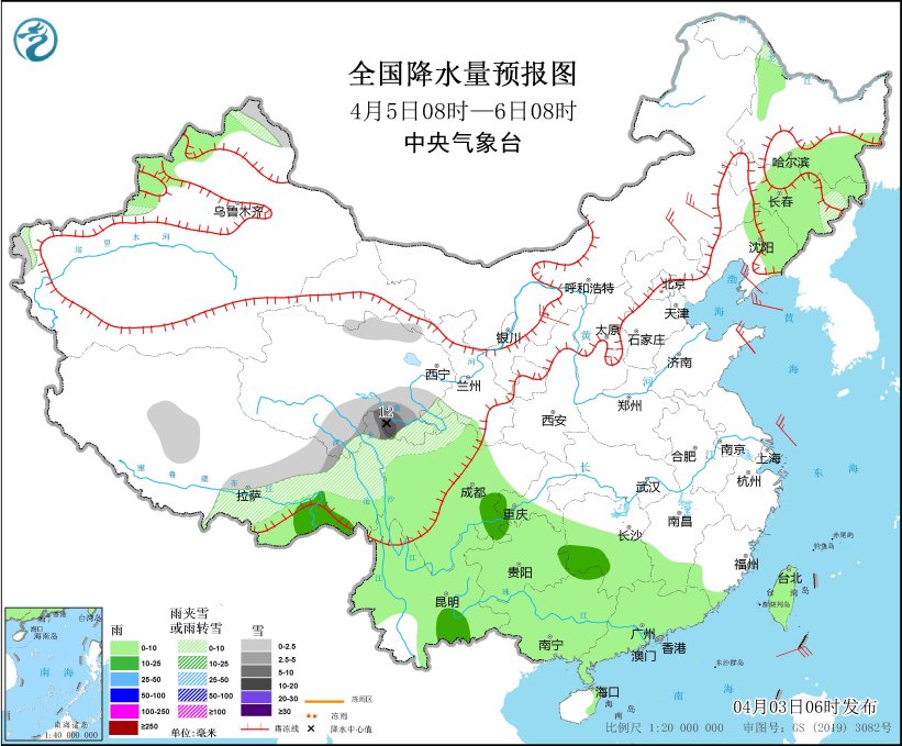 4月5日08时至6日08时,新疆阿勒泰地区、西藏东部、青海东南部、川西高原北部等地部分地区有小到中雪或雨夹雪,其中,青海东南部、川西高原北部等地部分地区有大雪,局地暴雪(10~12毫米)。东北地区中南部、西藏东南部、西南地区大部、江南西南部、华南、台湾岛等地部分地区有小雨,局地有中雨。内蒙古中东部、辽东半岛、山东半岛等地部分地区有4~5级风(见图3)。