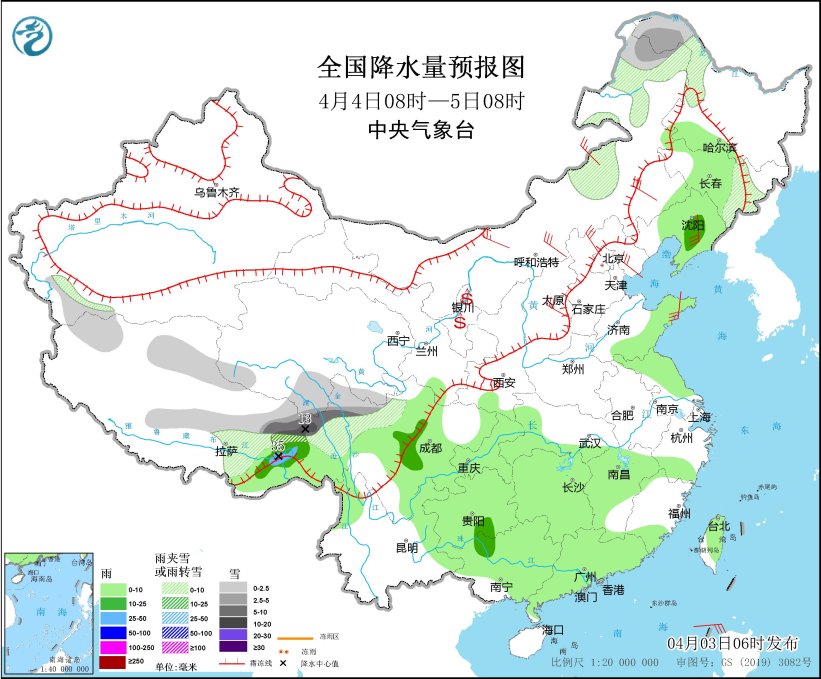 4月3日08时至4日08时,新疆沿天山一带和南疆西部山区、内蒙古东北部、西藏东部、青海东南部、川西高原北部等地部分地区有小到中雪或雨夹雪,其中,西藏东北部、川西高原北部等地部分地区有大雪(5~9毫米)。吉林东部、辽东半岛、山东半岛、山西中北部、西藏东南部、甘肃南部、陕西南部、西南地区东部、江南西部、云南南部、台湾岛等地部分地区有小到中雨,其中,西藏东南部部分地区有大雨(25~40毫米)。内蒙古中西部、西藏中北部、辽东半岛、山东半岛等地部分地区有4~6级风,其中,西藏北部部分地区有7~8级风(见图1)。