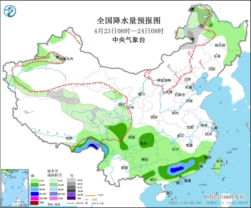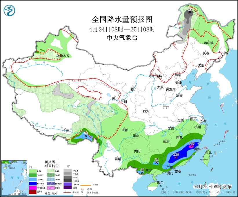 4月23日08时至24日08时,内蒙古东北部、黑龙江西北部、新疆沿天山地区和南疆西部山区、西藏北部、青海中南部、甘肃南部、川西高原北部等地部分地区有小到中雪或雨夹雪,其中,内蒙古东北部、黑龙江西北部等地部分地区有大雪或暴雪(10~15毫米)。江西南部、福建南部、广东中北部、广西东部和中部、川西高原东部、重庆中西部、云南西北部、西藏东南部等地部分地区有中到大雨,其中,西藏东南部、广东北部等地部分地区有暴雨(50~80毫米)。内蒙古中东部、河北北部、辽宁北部、西藏西部等地部分地区有4~6级风(见图1)。