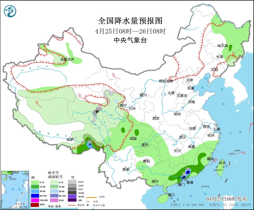 4月25日08时至26日08时,新疆沿天山地区和南疆山区、西藏北部、青海东部和南部、川西高原北部等地部分地区有小雪或雨夹雪,局地有中到大雪(5~8毫米)。福建中南部、广东大部、广西东部、四川盆地西北部、西藏东南部等地部分地区有中到大雨,其中,广东中东部等地部分地区有暴雨(50~80毫米)。内蒙古西北部、吉林东部、西藏西部、青海西部等地部分地区有4~6级风(见图3)。