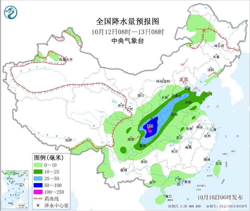 预计10日至13日,四川盆地北部、西北地区东部、华北等地有一轮强降雨,本次过程雨带逐渐南压,雨带西段强度强、累计雨量大、南压缓慢。其中今天,四川盆地西北部、甘肃东部和南部、陕西中部和南部、山西中部、河北中部等地部分地区有大到暴雨。中央气象台今晨继续发布暴雨蓝色预警。