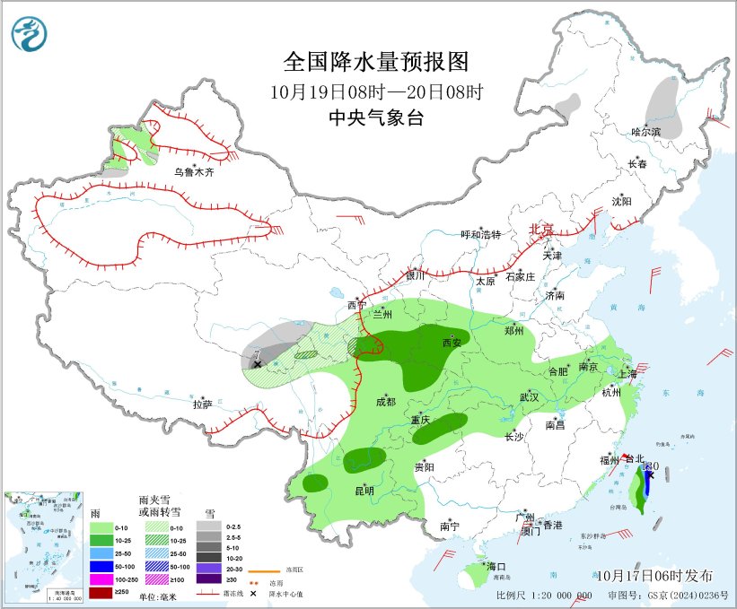 图5 全国降水量预报图(10月19日08时-20日08时)