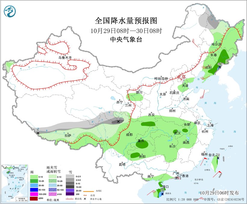 10月29日08时至30日08时,内蒙古东北部、黑龙江北部、新疆南疆西部山区、西藏东北部和南部、青海南部、川西高原等地部分地区有小到中雪或雨夹雪,其中,西藏南部、川西高原北部等地局地有大雪(5~8毫米)。吉林东部、辽宁东部、陕西南部、湖北东部、四川盆地东部、重庆西部、贵州西部和东北部、广东西南部沿海、海南岛、台湾岛东部等地部分地区有中到大雨,其中,海南岛东南部、台湾岛东部等地局地有暴雨(50~70毫米)。内蒙古东北部、辽宁中南部、山东半岛等地部分地区有4~6级风;渤海、渤海海峡、东海北部海域、北部湾将有5~6级、阵风7级的大风,东海南部海域、琼州海峡、南海北部海域、台湾海峡、台湾以东洋面、巴士海峡将有5~7级、阵风8~9级的大风(见图2)。