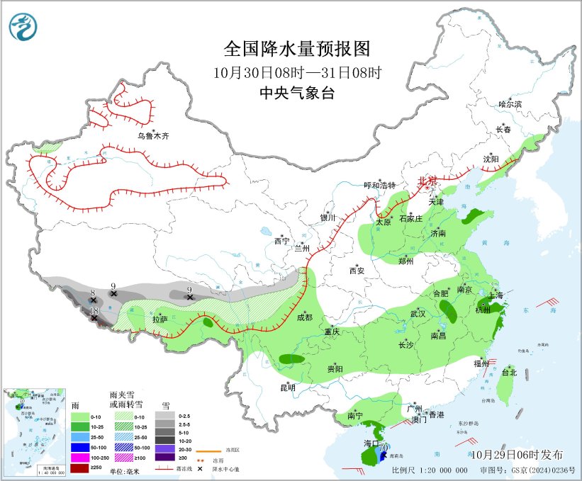 10月29日至11月2日,青藏高原东部有持续雨雪天气,西藏南部和中东部、青海南部、川西高原北部等地的部分地区有中到大雪或雨夹雪,局地有暴雪或大暴雪。