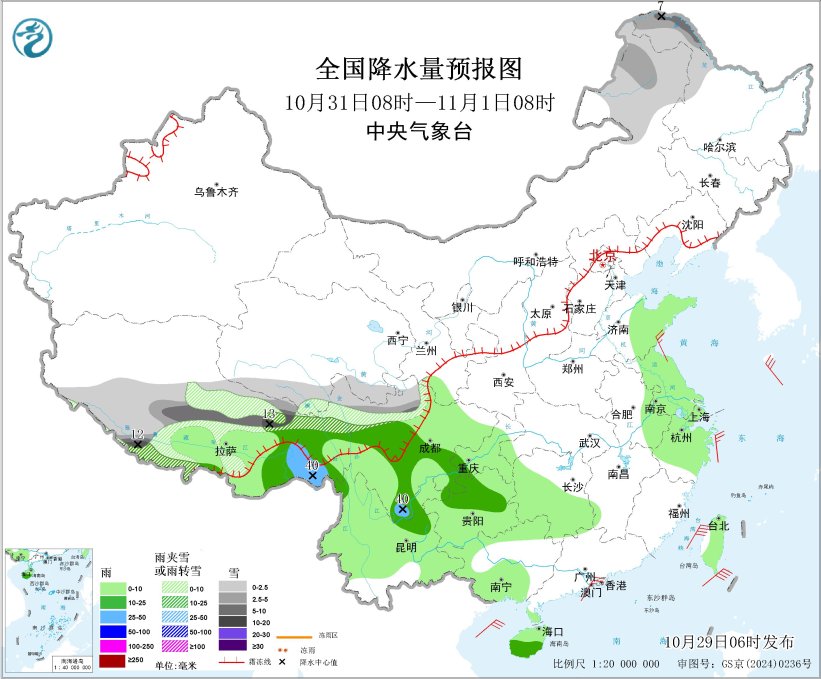 此外,29日至30日,西北地区东部、华北南部、东北地区中南部、黄淮、江汉、江南及西南地区、海南岛有小雨,部分地区有中到大雨、局地暴雨;内蒙古东北部、黑龙江北部、吉林东部的部分地区有小到中雪或雨夹雪、局地有大雪。31日至11月2日,内蒙古中东部、华北、东北地区、黄淮等地气温将下降4~6℃,局地降温8℃以上;31日至11月3日,西南地区、江南西部和南部、广西、海南岛及西北地区东部、东北地区等地有小雨,部分地区中到大雨,内蒙古东部、黑龙江大部和吉林的部分地区有雨夹雪或小到中雪。