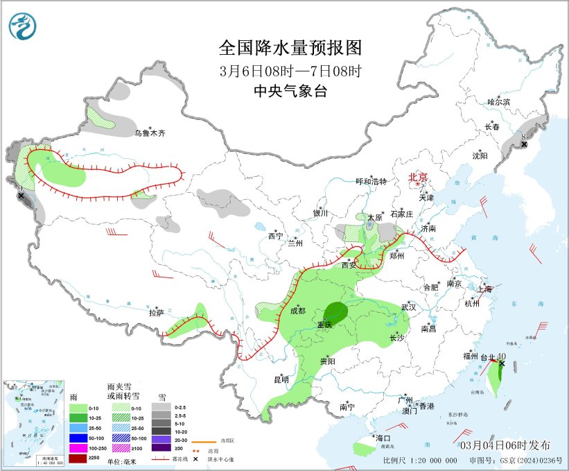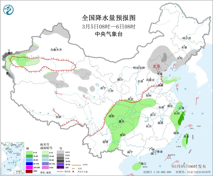 图1 全国降水量预报图(3月4日08时-5日08时)