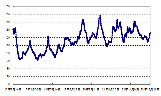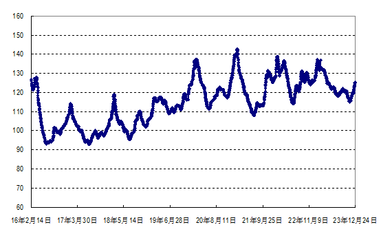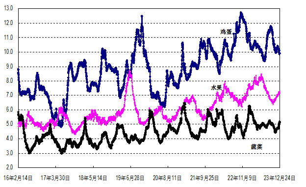 据农业农村部监测,2023年第51周(2023年12月18日—12月24日,下同)“农产品批发价格200指数”为124.67(以2015年为100),比前一周升2.44个点,同比低1.02个点;“‘菜篮子’产品批发价格200指数”为125.52(以2015年为100),比前一周升2.88个点,同比低1.58个点。