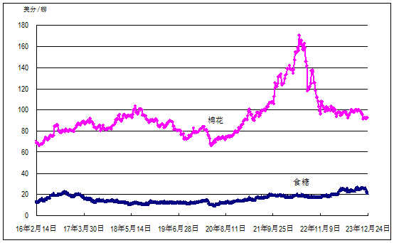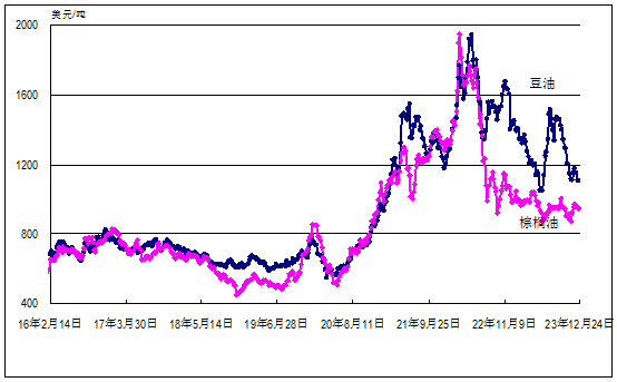 国际糖料理事会原糖周均价每磅20.73美分(每吨457美元),环比跌5%,同比高8%;国际棉花指数(SM级)每磅91.18美分(每吨2010美元),环比跌2%,同比低12%;马来西亚棕榈油荷兰鹿特丹港到岸周均价每吨937美元,环比跌1%,同比低4%;美国芝加哥商品交易所大豆和豆油最近期货合约收盘周均价每吨分别为481美元和1100美元,环比均跌1%,同比分别低11%和24%。