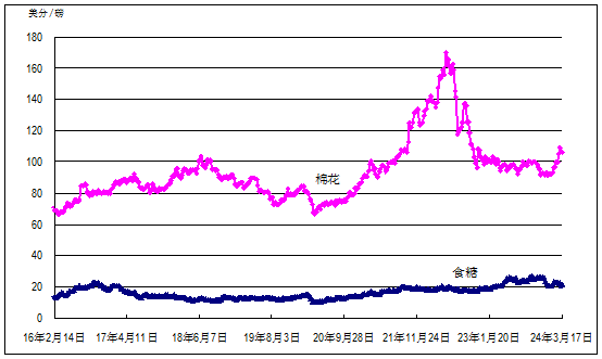 美国芝加哥商品交易所小麦最近期货合约收盘周均价每吨为195美元,环比跌1%,同比低24%;国际棉花指数(SM级)每磅106.20美分(每吨2341美元),环比跌1%,同比高10%。