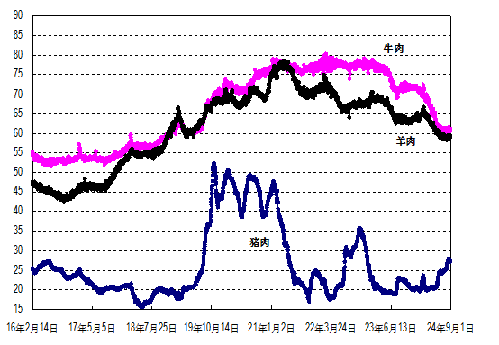 1. 牛羊肉、鸡蛋价格小幅上涨,猪肉价格小幅回落。猪肉批发市场周均价每公斤27.40元,环比跌0.9%,同比高20.8%;牛肉批发市场周均价每公斤60.74元,环比涨0.2%,为连续3周上涨,同比低15.7%;羊肉周均价每公斤59.15元,环比涨0.7%,同比低7.2%;白条鸡批发市场周均价每公斤17.52元,环比跌1.3%,同比低4.4%。鸡蛋批发市场周均价每公斤10.68元,环比涨0.4%,涨幅比上周收窄2.0个百分点,同比低6.7%。