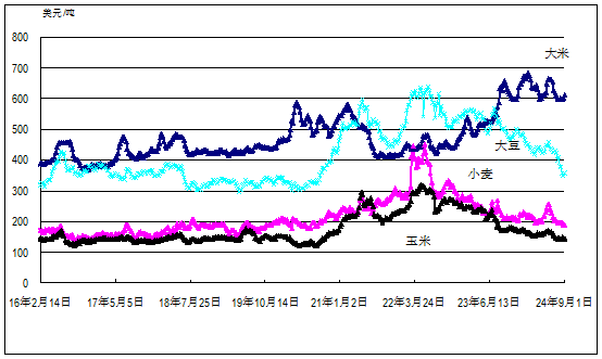 美国芝加哥商品交易所玉米和小麦最近期货合约收盘周均价每吨分别为145美元和189美元,环比均跌1%,同比分别低21%和10%。