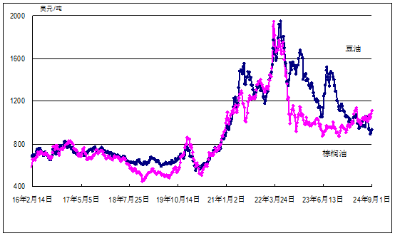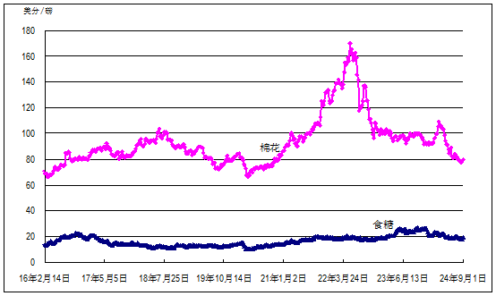 国际糖料理事会原糖周均价每磅19.23美分(每吨424美元),环比涨8%,同比低23%;美国芝加哥商品交易所豆油和大豆最近期货合约收盘周均价每吨分别为930美元和356美元,环比分别涨3%和2%,同比分别低36%和30%;马来西亚棕榈油荷兰鹿特丹港到岸周均价每吨1110美元,环比涨3%,同比高16%;泰国100%B级和5%破碎率大米曼谷离岸周均价每吨分别为612美元和597美元,环比均涨2%,同比均低6%;国际棉花价格指数(SM级)每磅79.76美分(每吨1758美元),环比涨1%;同比低20%。