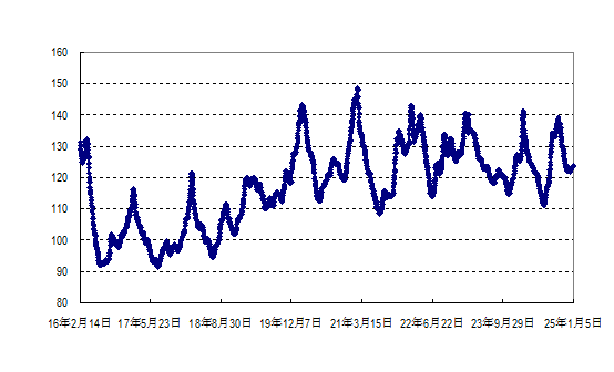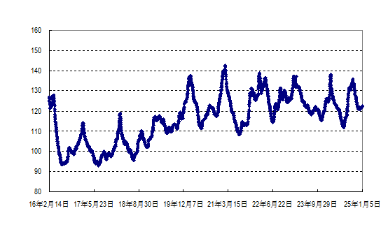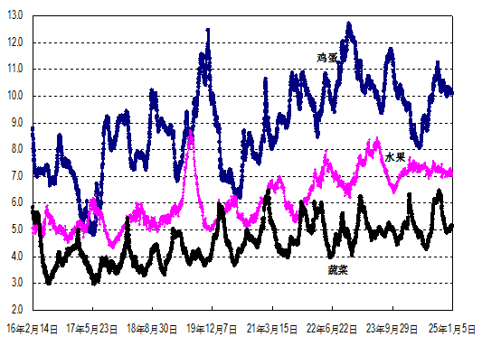 据农业农村部监测,2025年第1周(2024年12月30日—2025年1月5日,下同)“农产品批发价格200指数”为122.10(以2015年为100),比前一周升0.44个点,同比低3.94个点;“‘菜篮子’产品批发价格指数”为123.52(以2015年为100),比前一周升0.52个点,同比低3.63个点。
