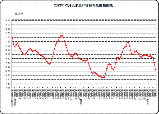 家禽产品价格。全国鸡蛋平均价格10.28元/公斤,比前一周下跌4.3%,同比下跌4.4%。河北、辽宁等10个主产省份鸡蛋价格8.75元/公斤,比前一周下跌7.0%,同比下跌4.7%。全国鸡肉平均价格23.54元/公斤,比前一周下跌1.1%,同比下跌3.0%。商品代蛋雏鸡平均价格4.11元/只,比前一周上涨0.2%,同比上涨12.3%。商品代肉雏鸡平均价格3.39元/只,比前一周下跌1.5%,同比下跌4.0%。