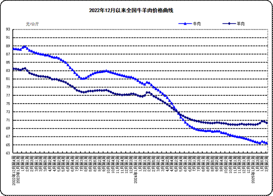 牛羊肉价格。全国牛肉平均价格65.43元/公斤,比前一周下跌0.3%,同比下跌18.2%。河北、内蒙古、吉林、黑龙江、山东和新疆等主产省份牛肉价格53.96元/公斤,比前一周上涨0.2%。全国羊肉平均价格70.31元/公斤,比前一周下跌0.4%,同比下跌9.5%。河北、内蒙古、山东、河南、四川、甘肃和新疆等主产省份羊肉价格64.30元/公斤,比前一周下跌0.2%。