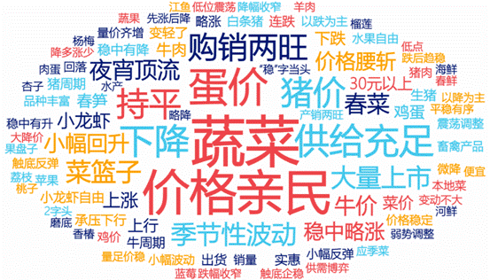 1. 猪牛羊肉价格略有上涨,鸡蛋价格小幅上涨。猪肉批发市场周均价每公斤20.75元,环比涨0.3%,同比高0.6%;牛肉批发市场周均价每公斤61.44元,环比涨0.3%,为连续6周小幅上涨,累计涨幅7.4%,同比低6.7%;羊肉批发市场周均价每公斤59.25元,环比涨0.6%,同比低4.5%;白条鸡批发市场周均价每公斤17.37元,环比跌0.4%,同比低0.5%。鸡蛋批发市场周均价每公斤8.11元,环比涨2.1%,同比低1.0%。
